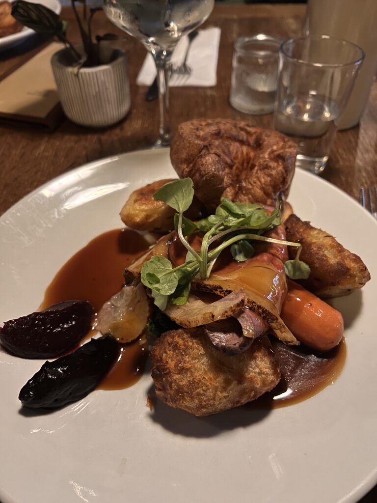 The Sunday roast menu offers proper choices (beef, chicken, pork, lamb) and the execution is the kind that makes you understand why the British take this meal so seriously. We’re talking tender meat, proper roasties with actual crisp on them, a rich gravy, and our favorite, Yorkshire pudding. For dessert, do not miss their sticky toffee pudding. (We actively tried to top this throughout the rest of our trip but we all agreed that this was the best!)